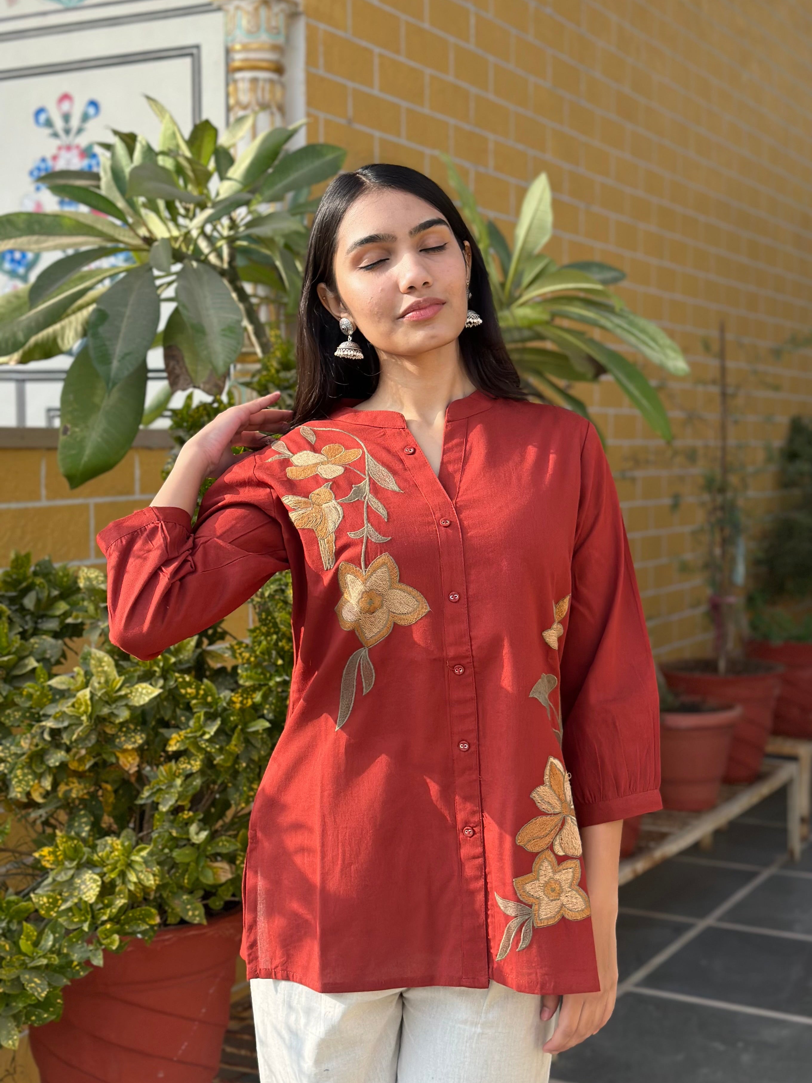 Rust Cotton Flex Kurti With Floral Embroidery