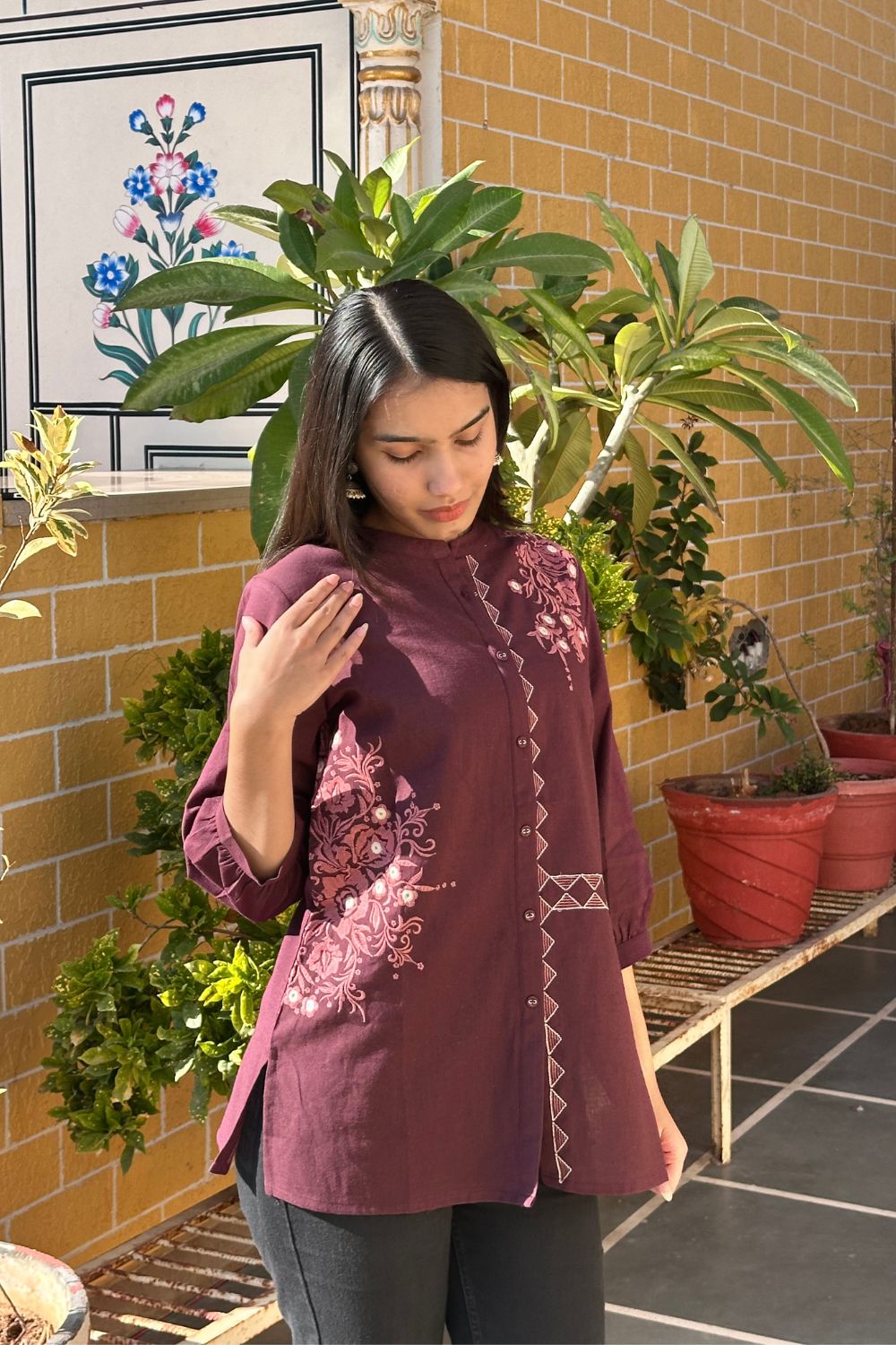 Wine Cotton Flex Embroidered Women Short Kurti Top